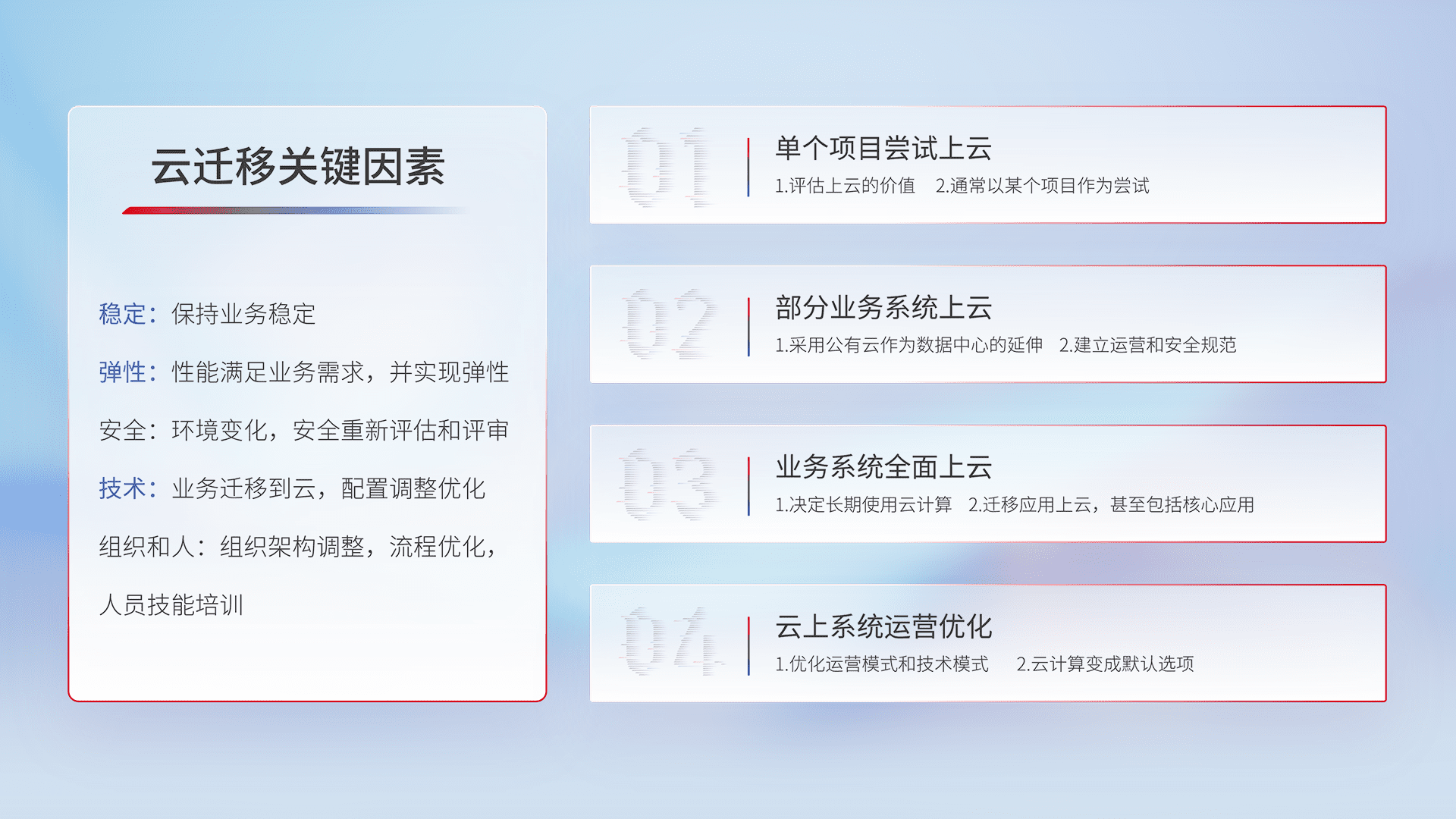 结合实际业务,,从规划设计、、云平台选型、、、、云原生改造、、数据迁移、、集成交付,,,迁移全过程为客户识别最佳上云路径,,,做好风险识别管理,,,,设计网络架构、、、、身份权限、、、、安全审计合规、、、操作审计、、、日志审计、、监控告警策略、、多站点容灾设计等,,,,对云上基础设施进行整体规划,,提升IT治理水平,,,以满足弹性、、高可用、、、高性能的需求。。。